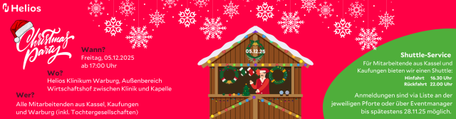 wie im Podcast bereits angekündigt, freuen wir uns, Sie zur gemeinsamen Cluster-Weihnachtsparty der Helios Kliniken Kassel, Kaufungen und Warburg am 05.12.2025 ab 17 Uhr vor dem Helios Klinikum Warburg einladen zu dürfen.